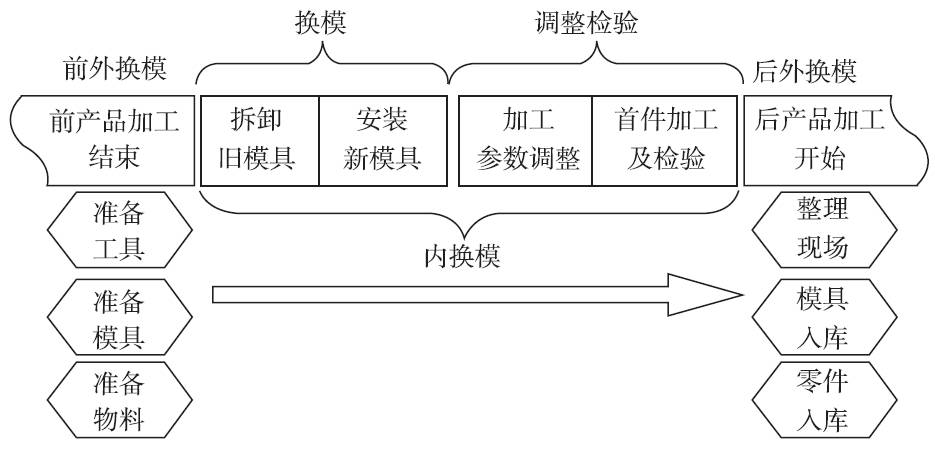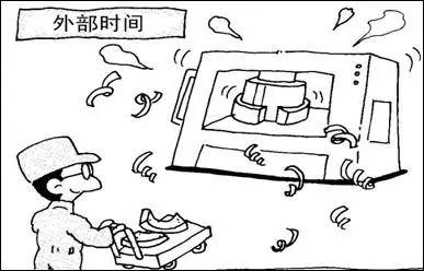 外部切換時(shí)間,是即使不停機(jī)也可進(jìn)行的作業(yè)切換時(shí)間,如模具、工夾具的準(zhǔn)備、整理時(shí)間等。如下圖: